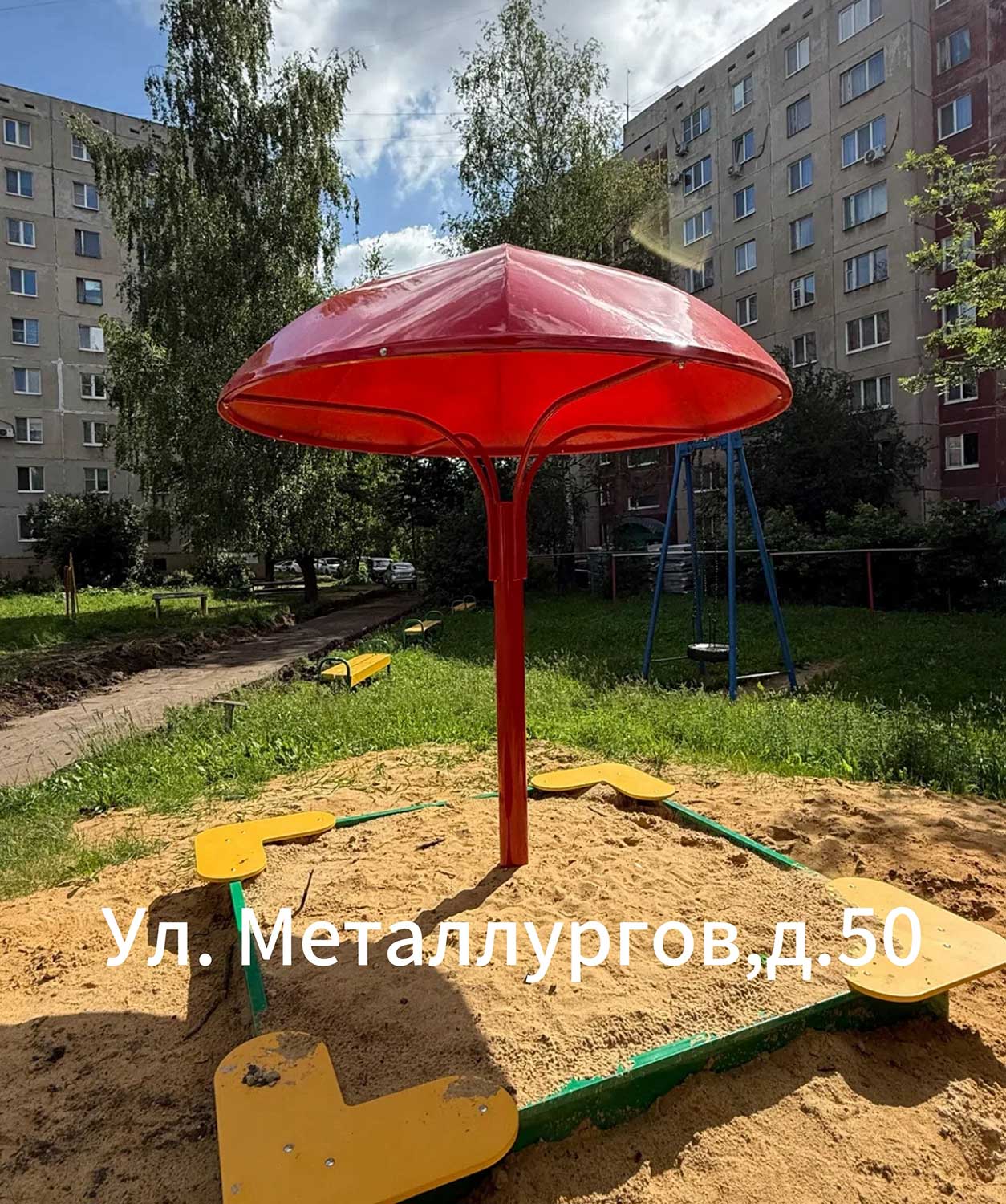 - Улица Металлургов, дом 50: Во дворе установлено игровое оборудование – большая песочница с металлическим грибком.